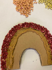 3. After separating the seeds by color, use a butter knife to spread the peanut butter on the cardboard one line at a time. Place and press in colored seeds onto the peanut butter. Continue with each different colored seeds.